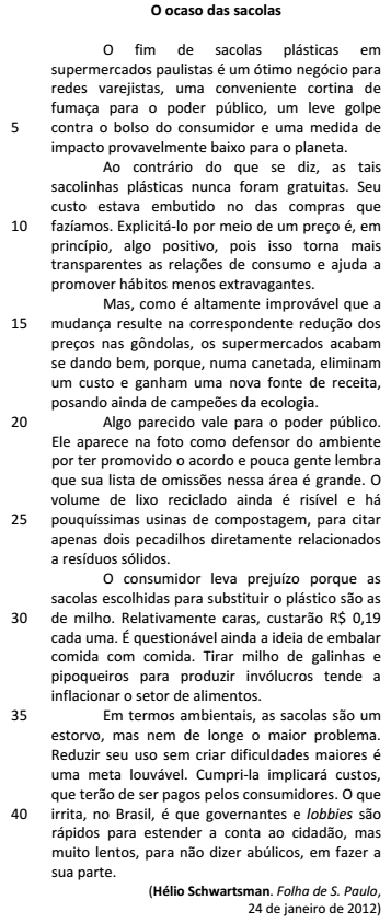 Mas, como é altamente improvável que a mudança resulte na correspondente redução dos preços nas gôndolas, os supermercados acabam se dando bem, porque, numa canetada, eliminam um custo e ganham uma nova fonte de receita, posando ainda de campeões da ecologia. (L.14-19)